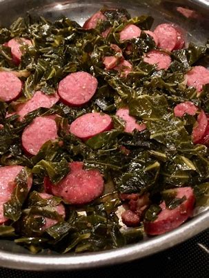 This photo is a pot of greens and sausage.